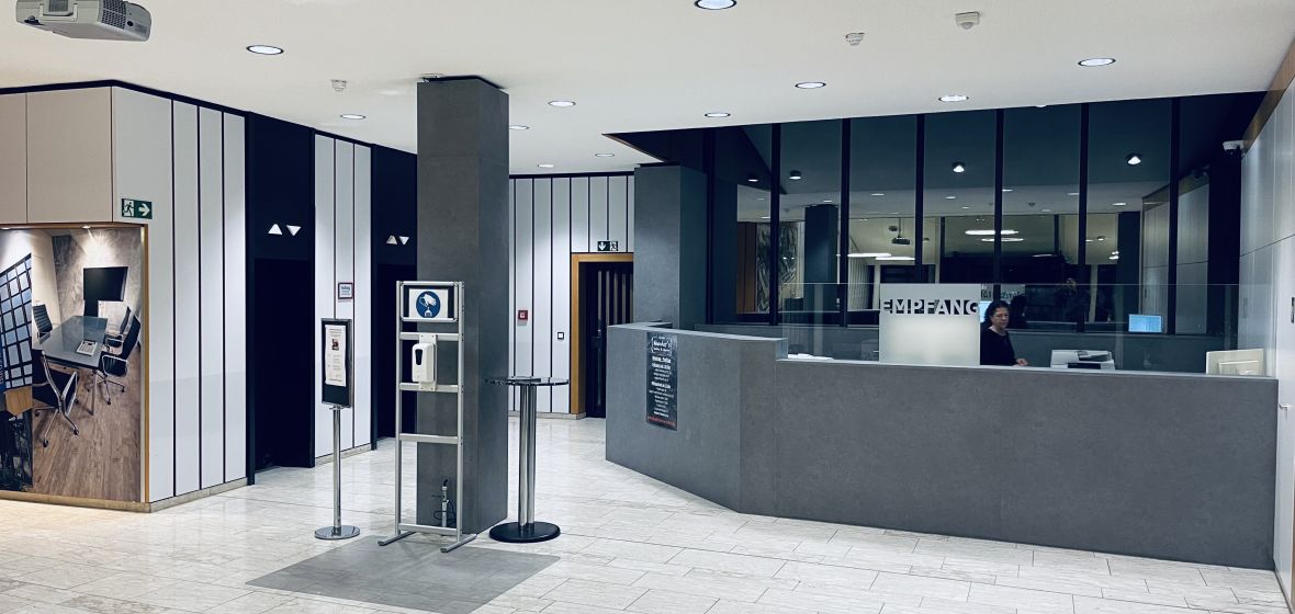 Hier ist der Empfang des Officecenters. Hier erhalten Sie Ihre Post und Paketsendungen. Hier werden Ihre Gäste empfangen und entsprechend weitergeleitet.